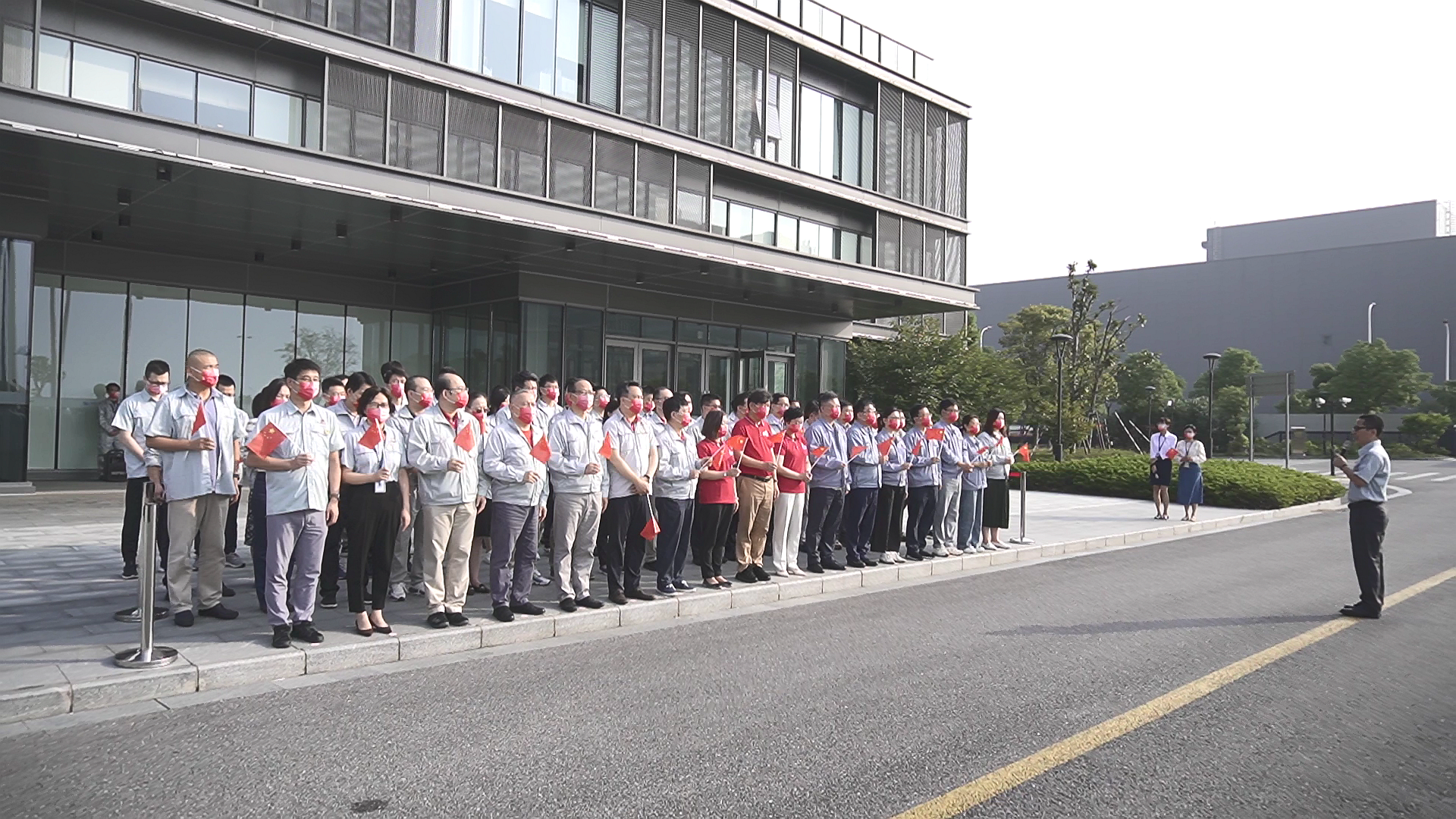 早上8:00,升國旗儀式正式開始,全體人員同唱《中華人民共和國國歌》,向國旗行注目禮,莊嚴肅穆的國歌聲回蕩在華虹六廠,鮮艷的五星紅旗在嘹亮的國歌聲中冉冉升起,愛國之情在心中激蕩。